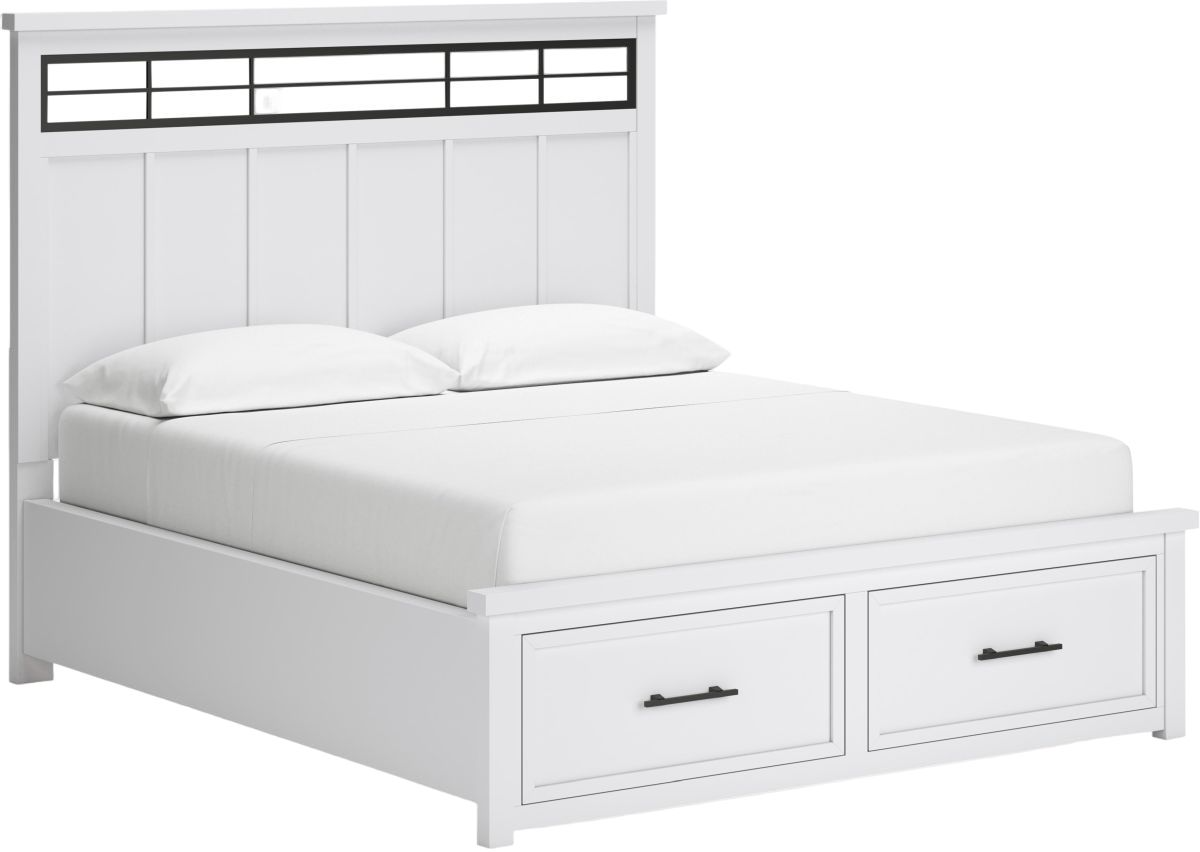 This king panel storage bed delivers casual style with substance. An inset metal detail on the headboard displays a unique take on modern farmhouse design. The bed's sturdy silhouette, classic white finish and black pulls exude a comfortably cozy vibe in your soothing sanctuary. Storage drawers are spacious enough for all your essentials.Read More
