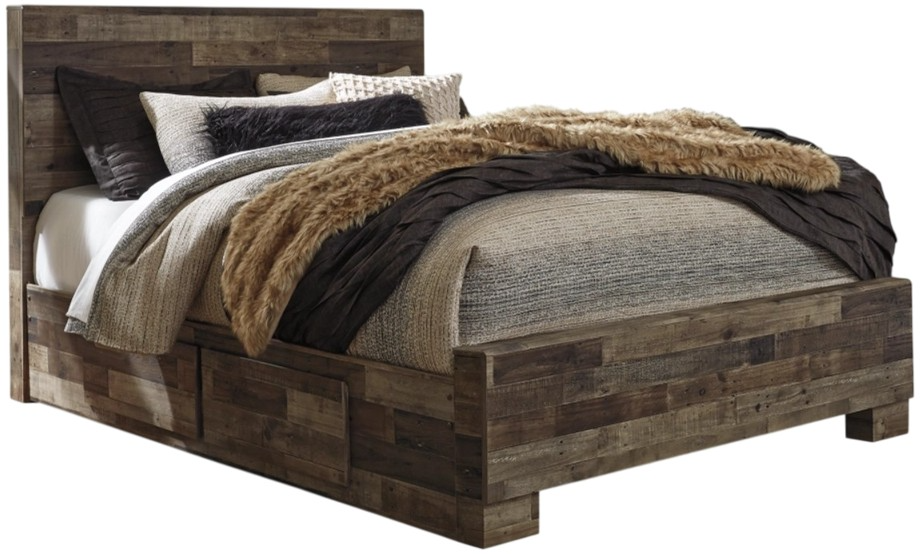 Modern yet hefty. This queen panel bed with storage makes an urban eclectic statement. Seasoned raw wood look merges with the clean lined design we love today. Muted rustic finish over replicated pine grain maintains its authenticity for a beauteous look.Read More