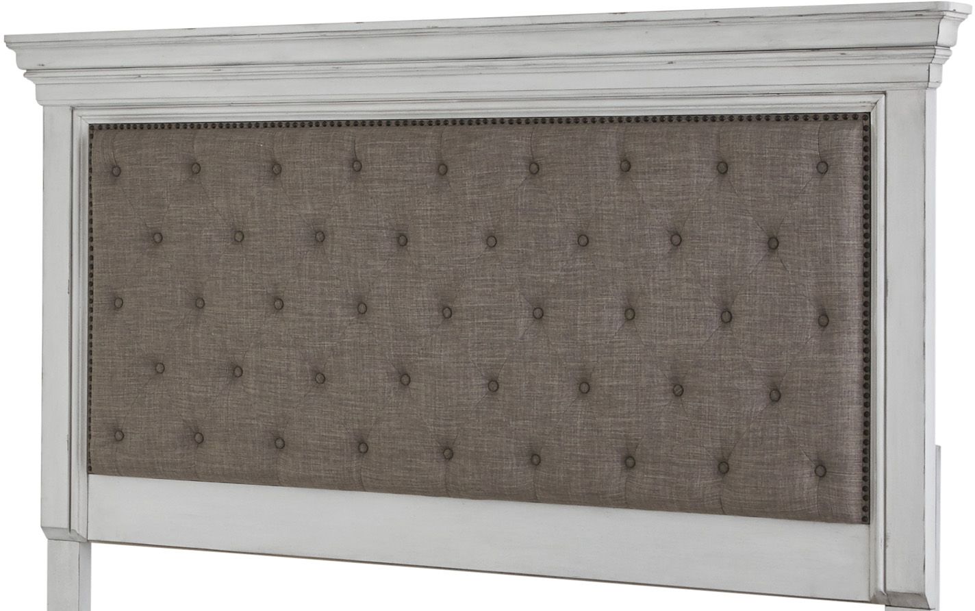Create your own cozy sanctuary with this relaxed vintage upholstered bed. The tufted upholstered headboard radiates modern farmhouse style. Other details such as turned bun feet and picture frame molding add a touch of cottage charm to the distressed white finish of this bed.