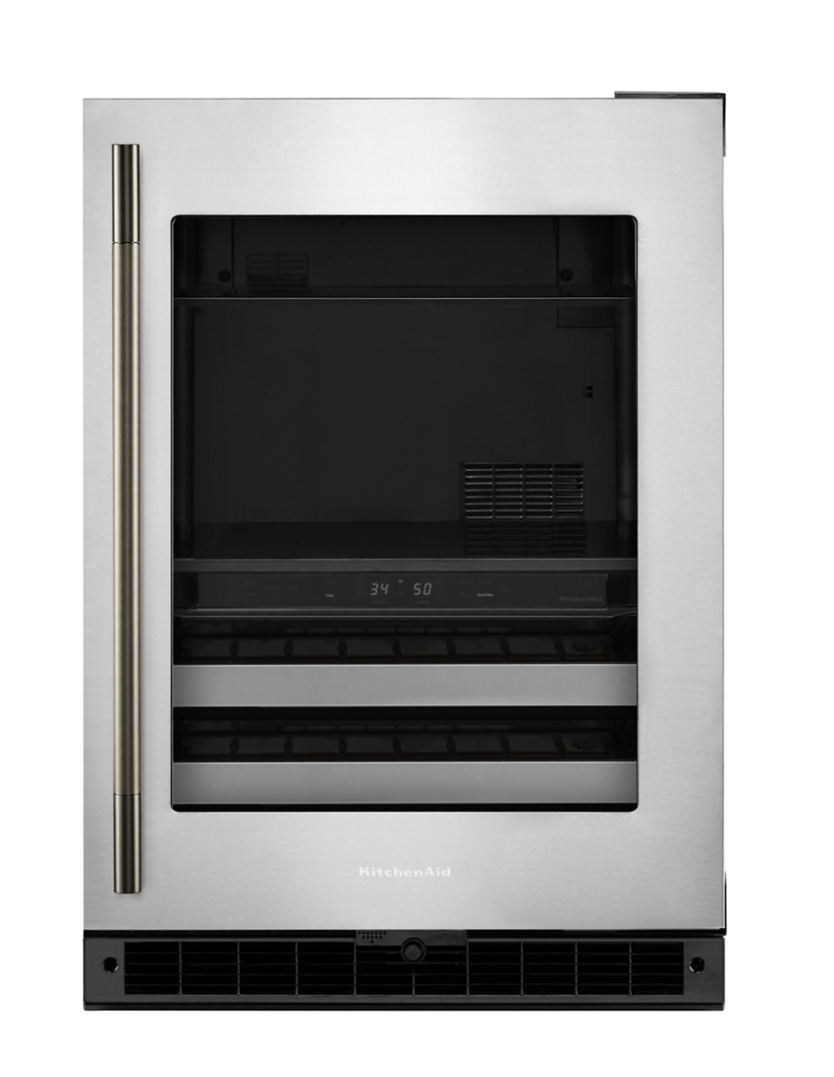 This 24" Undercounter Beverage Center with Full-Extension Metal-Front Racks stores 14 wine bottles below with room for drinks and food on the full-width shelves above. Two Temperature-Controlled Zones adjust for what you’re storing, and a Temperature Monitoring System with sensor alert adds peace of mind. Fully Flush Installation with Hidden Hinges provides a built-in look within cabinetry.Read More