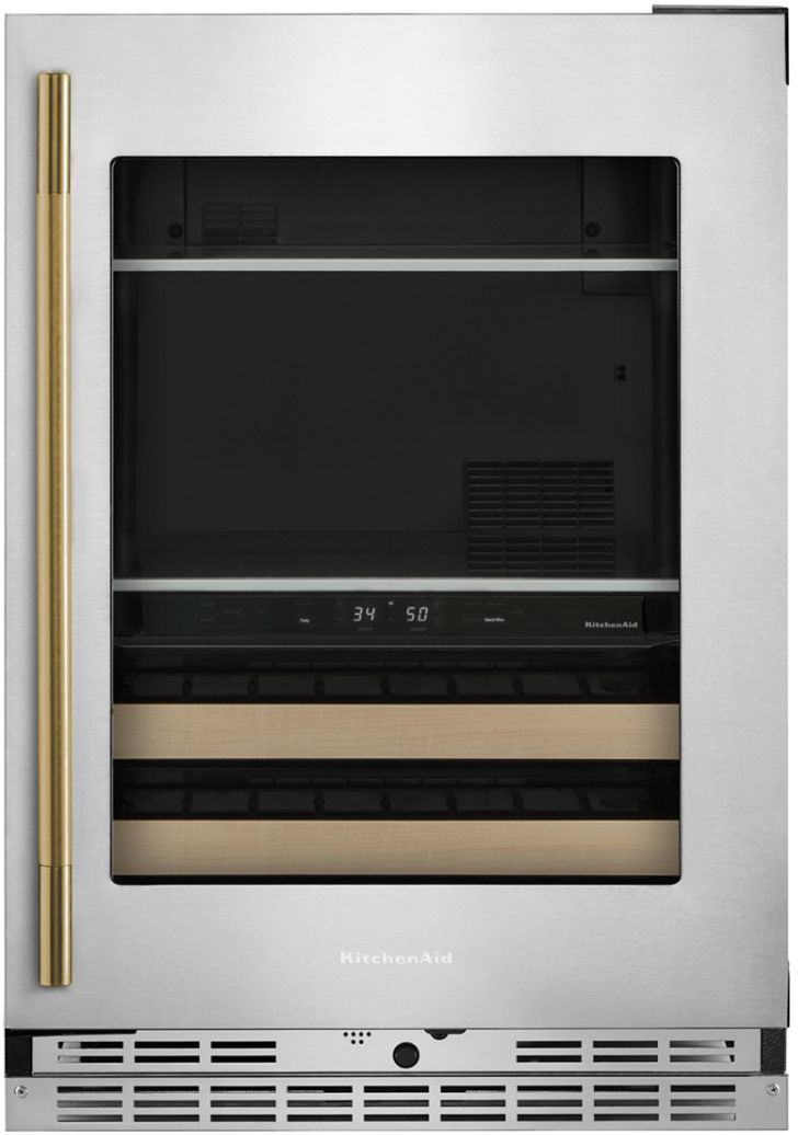 This 24" Undercounter Beverage Center with Full-Extension Wood-Front Racks stores 14 wine bottles below with room for drinks and food on the full-width shelves above. Two Temperature-Controlled Zones adjust for what you’re storing, and a Temperature Monitoring System with sensor alert adds peace of mind. Fully Flush Installation with Hidden Hinges provides a built-in look within cabinetry.Read More