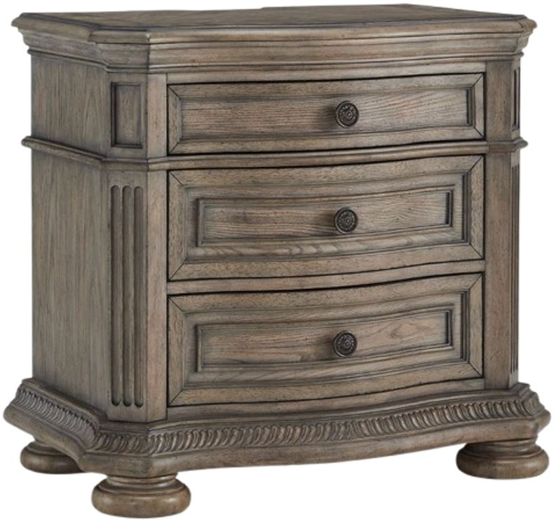 Merging traditional elegance with contemporary comfort, this nightstand takes your bedroom retreat to the next level. Serpentine curves, ash swirl veneer inlays on the top and a glazed antiqued-look finish radiate timeless sophistication. Drawers are packed with ample bedside storage possibilities. A convenient 110V power supply and USB charging add a modern touch.Read More