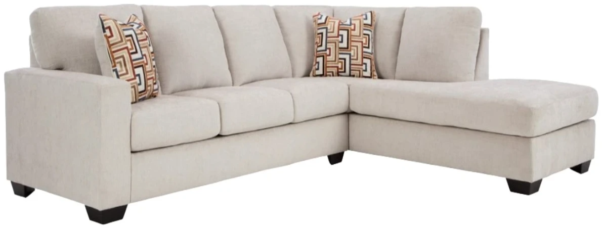 Liven up your living room with this sectional with chaise. Its trend-right light neutral upholstery is a perfect blank canvas for adding pops of color. Bold and eclectic accent pillows complete the look. Pairing posh style with everyday comfort, the sectional is a welcome addition to contemporary spaces.Read More