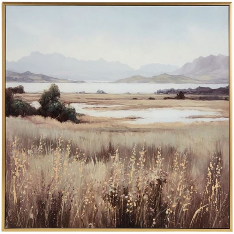 This wall art puts a peaceful spin on hanging decor. Its quiet landscape invites you to a lakeside field, with rolling mountains in the background that bring depth to the design. Hand-painted and gold leaf embellishments make each piece unique.Read More