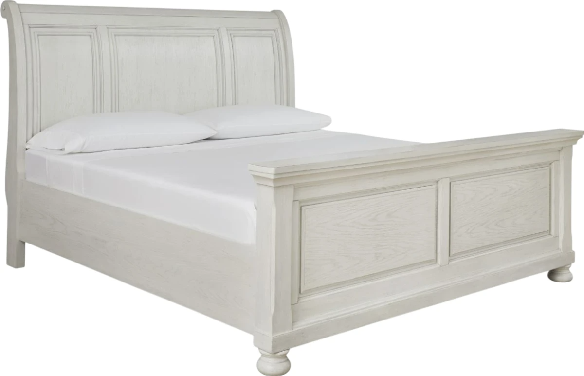 Elegant, timeless furnishings take your bedroom to the next level. Nothing does that better than this king sleigh bed. The antiqued white finish with a wonderful grain texture radiates sophistication, making this the perfect piece to round out the ultimate tasteful bedroom.Read More